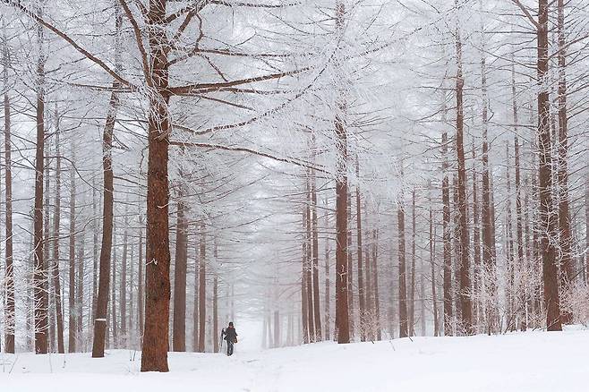 하얗게 쌓인 눈 위로 이어진 숲길을 걷다 보면 나무들이 만들어내는 차가운 공기와 은은한 나무 향기가 어우러져 마음까지 맑아지는 경험을 할 수 있습니다.