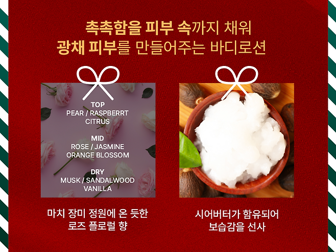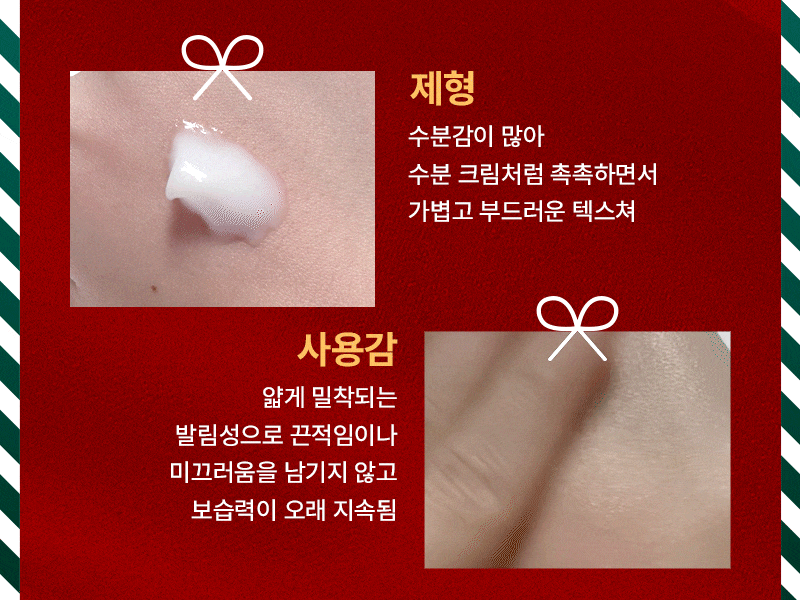 발림성도 촉촉하고 특히 마무리감이 아주 산뜻한 편! 로션 특유의 끈적임, 미끈거림을 싫어하는 사람들도 충분히 편안하게 사용할 수 있을 것 같아서 크리스마스 선물로 추천!