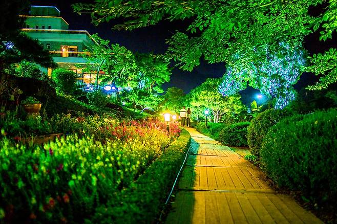 허브 족욕 카페에서 향긋한 물에 발을 씻을 수 있고, 곳곳에 조성된 포토존에서 인생샷을 남길 수 있습니다. 울창한 수목림과 사시사철 피어나는 꽃 가운데 닦여진 산책길을 거닐며 낭만적인 야경을 만끽할 수 있습니다.