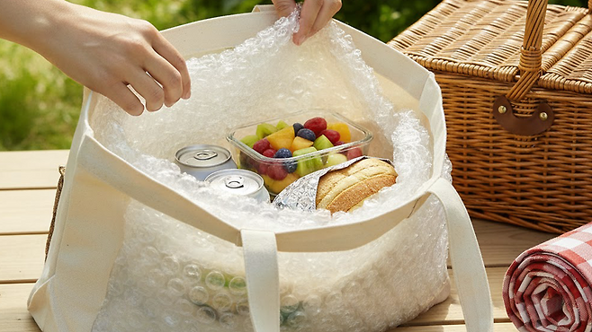 갑자기 아이스박스가 필요할 때, 뽁뽁이는 훌륭한 대안이 된다. 장바구니나 에코백 안쪽을 여러 겹으로 감싸주기만 해도 공기층이 단열재 역할을 한다.