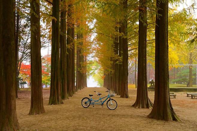 자전거를 타고 남이섬을 한 바퀴 도는 동안에는 마치 한 폭의 그림 속을 달리는 듯한 기분이 들곤 합니다.