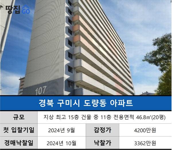 땅집고옥션에 따르면 해당 물건은 구미시 도량동에 있는 H아파트 11층, 전용면적 46.8㎡(약 14평)이다. 감정가는 4200만원으로, 감정평가를 진행한 2023년 당시에는 시세 수준이었지만 입찰을 진행한 시점 기준으로는 시세(5500만원)보다 34% 정도 낮았다.
