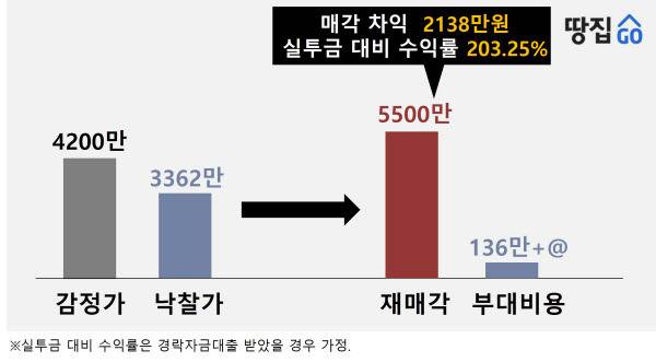 A씨는 낙찰 6개월 후인 올 4월 이 아파트를 5500만원에 매각하는 데 성공했다. 낙찰가 대비 매각차익은 2200만원. 수익률로 치면 66%에 달한다. 이 중 세금·중개수수료 등 부대비용을 제하고 남은 세후이익은 1600만원 안팎이었다.