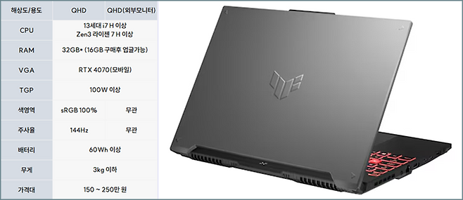 QHD 해상도에서 게임할 노트북을 찾으신다구요? '그돈씨' 함정에 빠지기 쉬운 영역이니까 조심하세요. 150만 원 들고 왔다가 250만 원짜리 노트북을 할부 칠 수도 있습니다. 150~250만 원 사이에 제품들이 너무 많아서 눈 돌아가거든요. 참고로 이 글에서는 2024년 주요 고사양 게임을 QHD, 높음Preset, 초당60프레임으로 돌릴 수 있는 사양을 기준으로 삼았어요. *3DMark Time Spy Test 그래픽스코어 1만 2,000점 전후의 성능