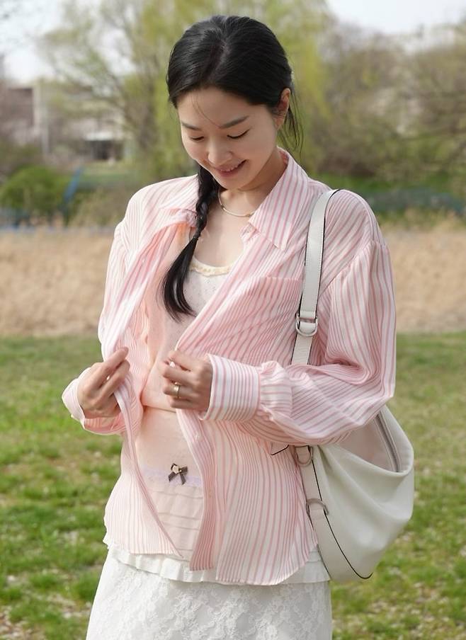 그룹 신화 전진의 아내 류이서가 핑크 스트라이프 셔츠로 벚꽃 여신 미모를 발산했다.