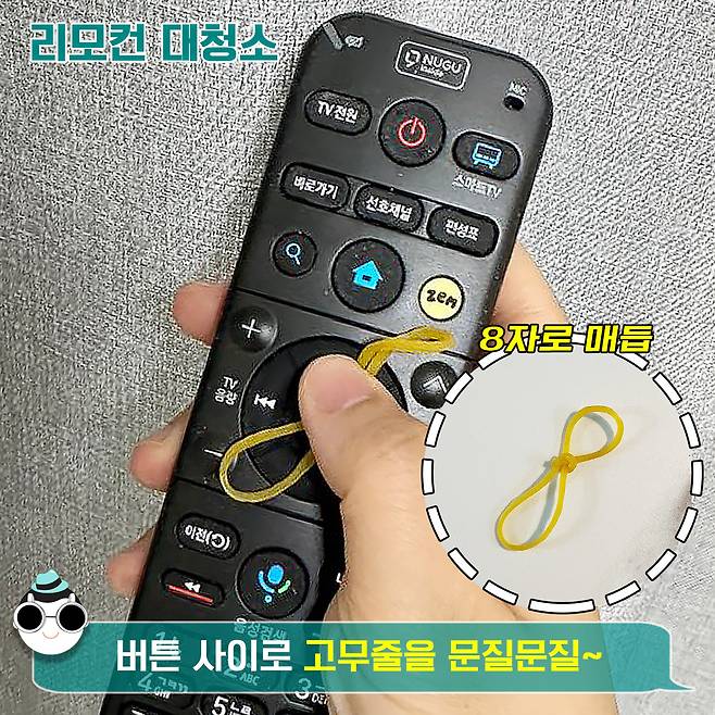 이럴 때 또 노란 고무줄을 소환해볼게요. 고무줄을 8자로 매듭지은 뒤 그 부분을 버튼 사이사이에 문질러주면 고무줄에 먼지가 달라붙어 청소가 쉬워요.