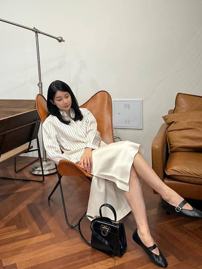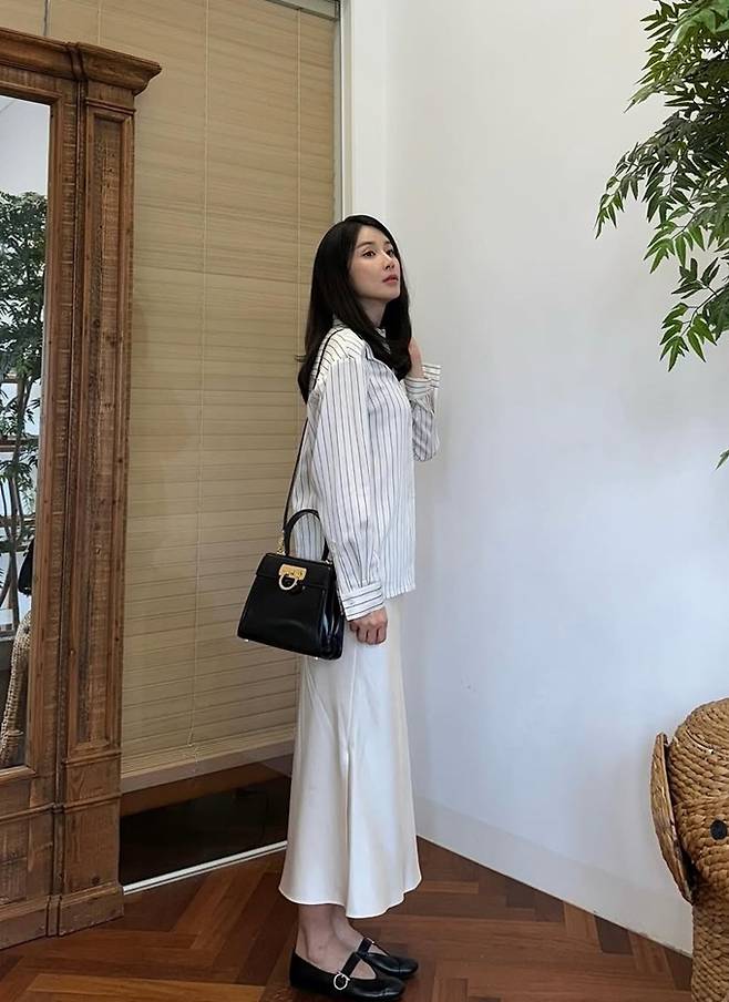 공개한 사진에서 이보영은 심플한 스트라이프 셔츠에 은은하게 광택이 도는 슬릿 새틴 스커트를 매치한 데일리룩으로 차분하면서도 고급스러운 분위기를 연출했다.