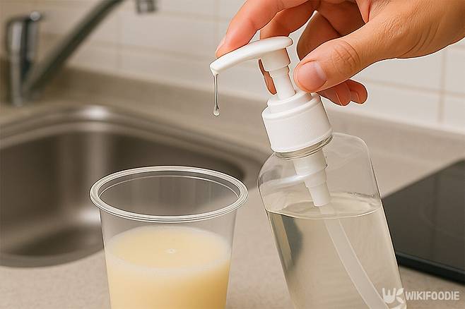 막걸리를 부은 컵에 주방세제를 2~3방울 떨어뜨린다. 이 단계가 중요하다. 세제가 들어가야 표면에 앉은 초파리들이 다시 날지 못한 채 그대로 가라앉는다.