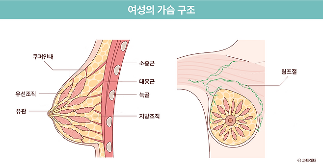 하지만 여성의 가슴은 남성의 흉부와 구조가 전혀 다릅니다. 여성의 가슴은 근육이 아니라 유선 조직과 지방층으로 이루어져 있으며, 이를 지지하는 것이 바로 쿠퍼 인대(Cooper’s Ligaments)입니다. 쿠퍼 인대는 흉곽에 매달려 있는 형태이기 때문에 강한 충격이나 지속적인 흔들림에 쉽게 손상될 수 있어요. 문제는 이 인대는 한 번 늘어나거나 손상되면 원래대로 회복되지 않는다는 점입니다.