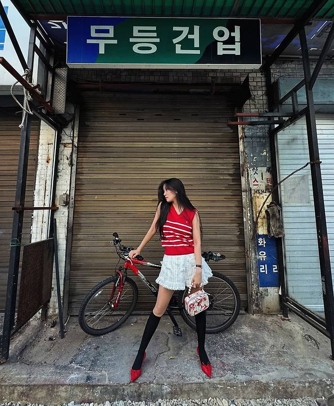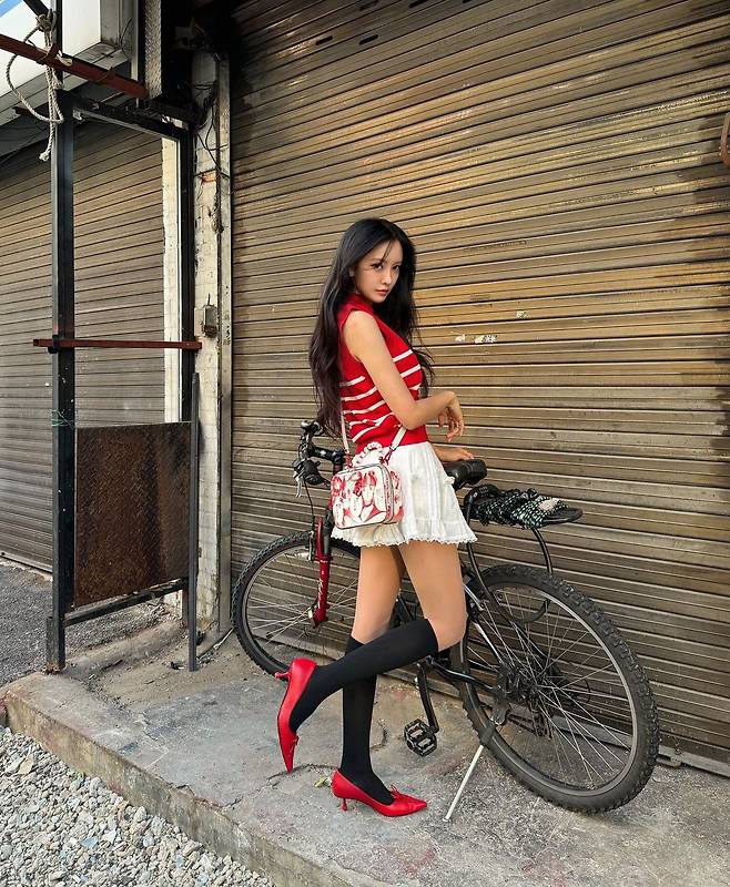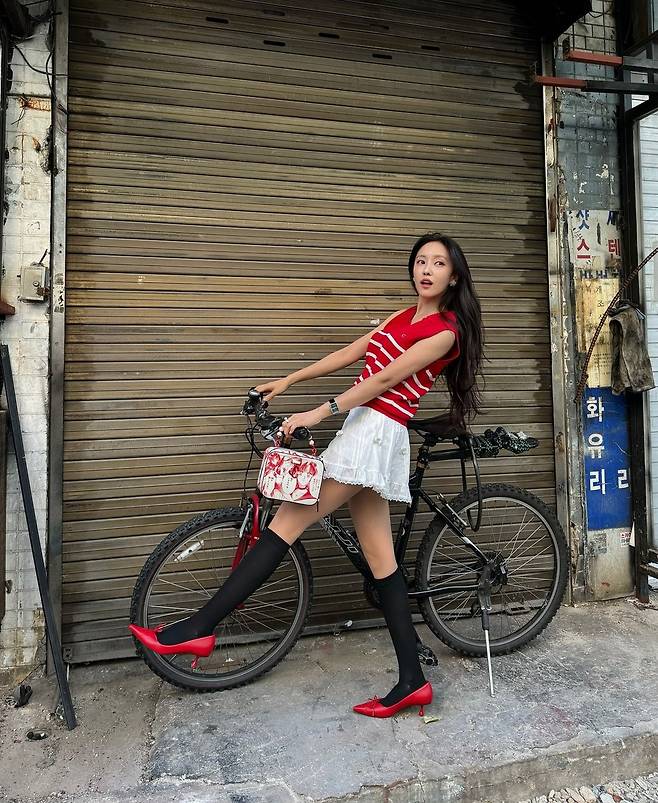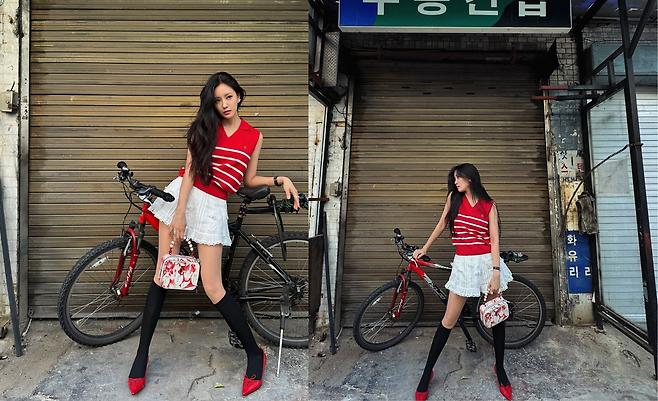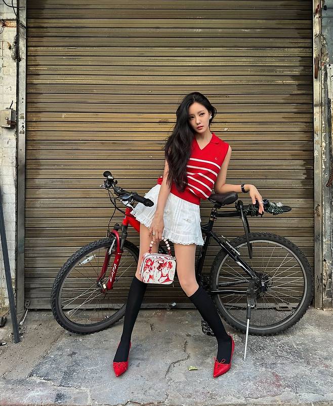 공개 된 사진 속 효민은 레드컬러의 화이트 스트라이프 카라 민소매 티를 입고 화이트 플리츠 미니스커트를 입어 날씬한 긴 기럭지를 자랑했다. 블랙 롱삭스와 레드컬러의 힐을 신어 레드와 블랙 컬러의 스타일링을 완벽하게 선보였다.