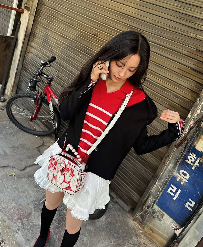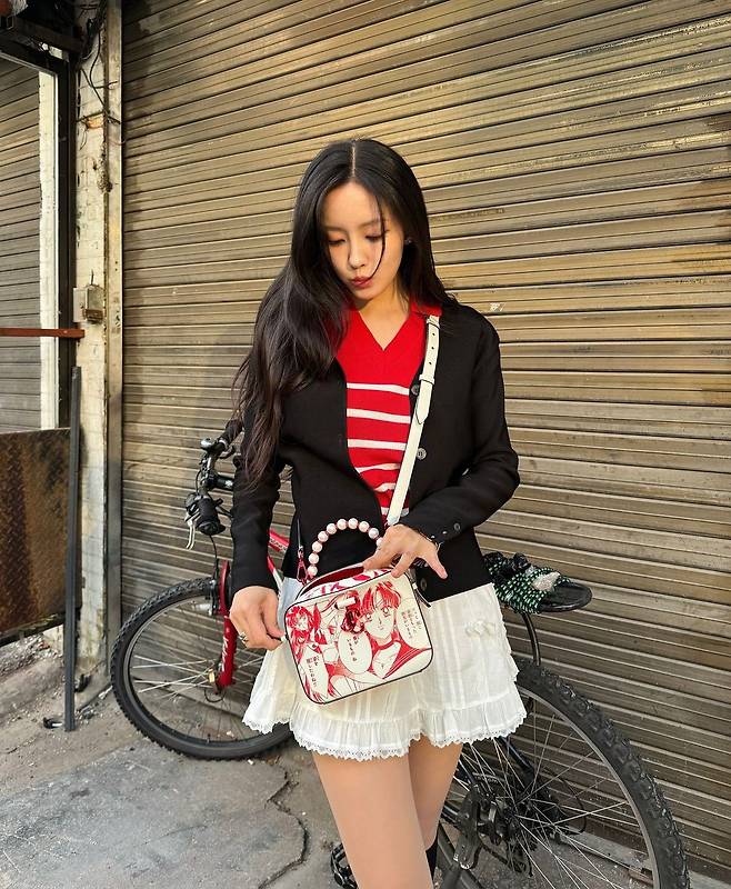 또한 애니메이션 세일러문이 그려진 진주 손잡이의 가방을 들어 개성있는 아이템을 매치하여 화제를 몰았다.