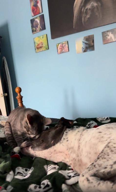 강아지는 그 모든 행동을 조용히 받아냅니다. 미동도 없이 그대로 누운 채, 조금은 더 여유로운 표정으로 눈을 감은 채 반응하죠. 마치 “응, 나도 네가 좋아”라고 말하는 듯한 기분 좋은 평온이 흘러나옵니다. 고양이는 몇 번의 머리 부비기를 마치고는 그 자리에 조용히 앉거나, 때론 강아지 옆에 등을 기대어 눕습니다.