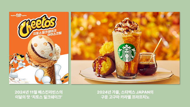 익숙한 브랜드 중에서도 이와 유사한 전략을 가진 F&B브랜드가 있어. 대표적으로 매월 이달의 맛을 출시하는 배스킨라빈스와 스타벅스의 시즈널 한정 메뉴가 있지. 모두 기간 내에 맛보지 못하면 다시는 먹을 수 없다는 소비자들의 심리를 자극해. 맛보다는 제품의 스토리나 비주얼이 강조되며, 나아가 특별한 콜라보 상품으로 특정 타겟을 사로잡기도 하지.