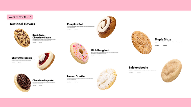 크럼블이 성공한 첫 번째 비결은 바로, 🍪매주 바뀌는 쿠키 라인업이야. 매주 토요일 크럼블의 온드미디어에는 그 주의 쿠키 라인업을 공개함과 더불어, 꼭 한 가지의 신메뉴이자 한정 메뉴를 선보이지. 하지만 크럼블의 정체성인 초코칩 쿠키는 매주 고정적으로 포함되는 메뉴라고 해😝