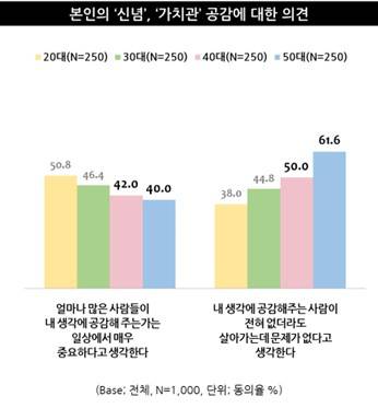 특히 이들 세대는 많은 사람들이 자신의 생각에 공감해 주는가를 중요하게(20대 50.8%, 30대 46.4%, 40대 42.0%, 50대 40.0%) 여기기보다 공감해 주는 사람이 전혀 없더라도 살아가는 데 문제가 없다(20대 38.0%, 30대 44.8%, 40대 50.0%, 50대 61.6%)고 여기는 태도가 뚜렷한 만큼, 자신의 입장을 고수하며 극단적인 정치 성향을 드러낼 가능성이 있음을 예상해 볼 수 있었다.