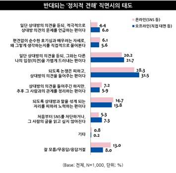 아울러 반대되는 정치적 견해를 접했을 때는 온·오프라인에 관계없이 되도록 논쟁을 피하고 상대방의 의견을 들어주는 경우가 많은 편이었고(온라인 28.3%, 오프라인 31.5%), 가볍게라도 자신의 의견을 피력하는 태도는 소폭 감소한 결과(온라인 25.8%(2021) → 20.2%(2023), 오프라인 27.2%(2021) → 21.7%(2023))를 보일 만큼, 논쟁 자체를 꺼려하는 모습을 살펴볼 수 있었다.