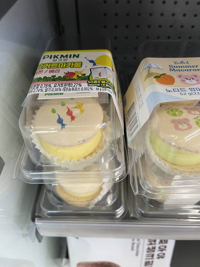 CU신상 피크민 요거트마카롱 레몬/베리는 게임 캐릭터를 활용하여 레몬과 딸기맛의 뚱카롱 디저트를 만들었어요.