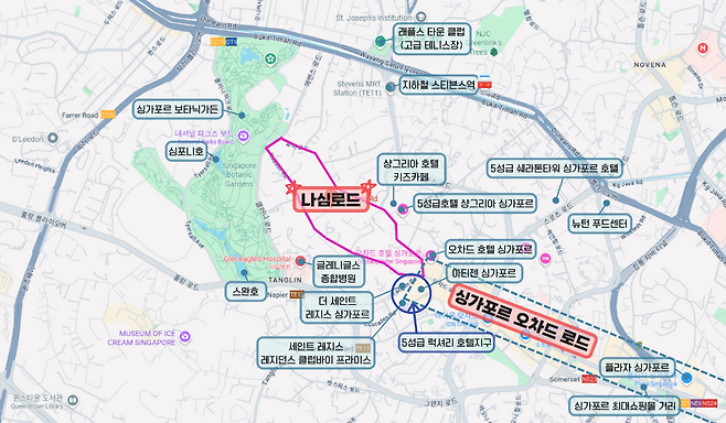 나심로드에는 싱가포르가 자랑하는 ‘GCB’ 유형의 저택이 여럿 존재한다. ‘GCB’는 대지면적 최소 1400㎡(약 420평) 이상, 건물 높이 2층 이하로 제한되는 단독저택이다. 대지면적이 넓은수록 높게 짓는 일반 상식과는 반대되는 형태다. 고층 건물이나 고밀도 개발을 막아 부촌의 상징성과 품격을 유지하려는 싱가포르 정부의 도시계획 철학이 담겨 있다. 효율 보다는 상징성과 품격을 강조하다 보니 자연스럽게 부자들의 주택 형태로 자리매김하게 됐다.