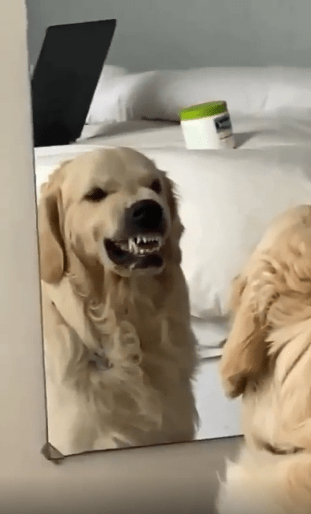 그러더니 강아지는 천천히 이빨을 살짝 드러내며 으르렁거리기 시작합니다. 거울 속 자신의 모습이 따라 하는 것을 보자, 강아지는 더 집중한 듯 코를 살짝 찡그립니다. 거울 속에서 자신이 화난 표정을 짓는 모습을 확인한 강아지는 마치 "이렇게 하면 무서워 보일까?"라고 생각하는 듯 보입니다.