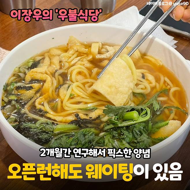 세 번째로 소개해 드릴 곳은 팜유&가루 왕자 이장우 배우의 <우불식당>입니다. 오픈할 때 엄청난 화제였는데 아직도 대기가 엄~청 긴 맛집으로 유명하더라구요. 오픈런을 해도 줄을 서야해서 밥심도 2번 포기하고 돌아온 곳이랍니다.