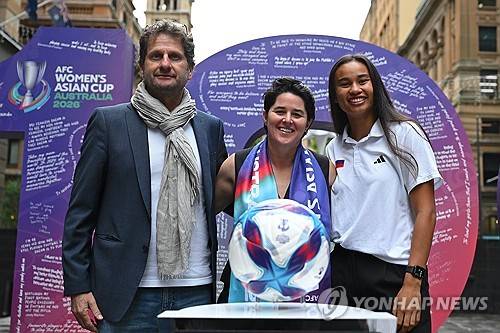 epa12538775 (L-R) Joe Montemurro, Australian head coach, Sarah Walsh, Chief Operating Officer, AFC Women’s Asian Cup Australia 2026 and Madison Ayson, Philippines international during the 100 Days to Go for the AFC Women’s Asian Cup 2026 at Martin Place Amphitheatre in Sydney, Australia, 21 November 2025. EPA/DEAN LEWINS AUSTRALIA AND NEW ZEALAND OUT