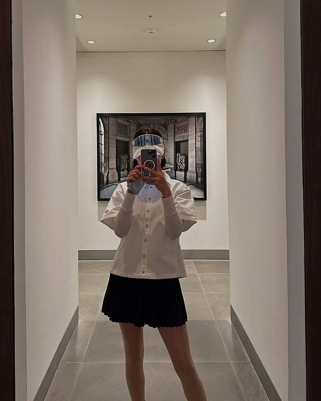 상의는 화이트 톤의 버튼업 아우터를 활용해 깔끔하면서도 레이어드 스타일링에 적합한 실루엣을 완성했다. 그 안에 입은 슬림핏 티셔츠는 피부에 밀착되는 핏으로 활동성을 강조한다. 하의는 클래식한 블랙 플리츠 스커트로 경쾌한 움직임을 살려주며, 전체적으로 모던하고 단정한 골프룩을 완성했다.