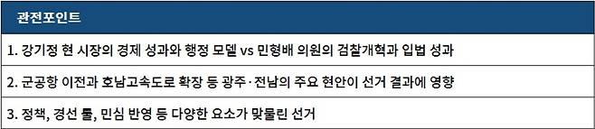 군공항 이전과 호남고속도로 확장 등 광주·전남의 주요 현안도 선거 결과에 중요한 영향을 미칠 것으로 보입니다.