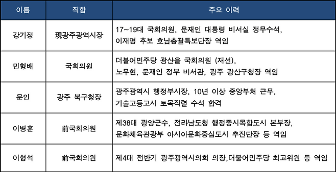 여러 지역 언론에 따르면 ▲강기정 현 광주광역시장 ▲민형배 국회의원 ▲문인 광주광역시 북구청장 ▲이병훈 전 국회의원 ▲이형석 전 국회의원이 출마 예정자로 거론되고 있습니다.
