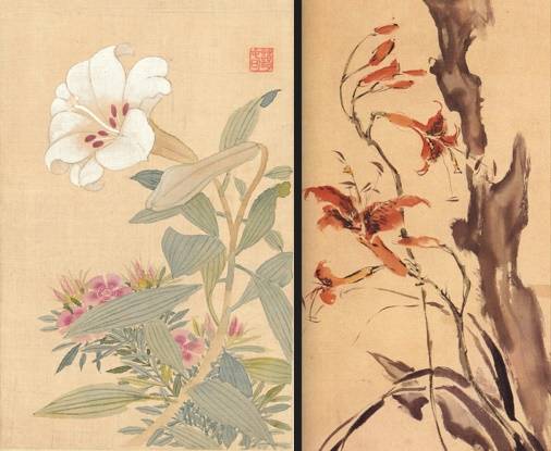 오른쪽 그림은 근현대기의 한국화가 이용우(1904~1952)의 <괴석과 나리꽃>이다. 화면의 왼편에 붉은색의 나리꽃을 멋스럽게 그렸다.