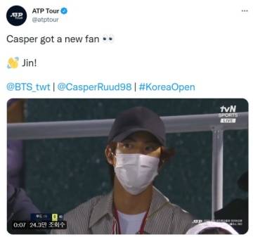 한편, 진이 올림픽공원 센터 코트를 방문했다는 소식에 ATP 공식 트위터도 방송 중계 화면을 캡처하여 실시간으로 게시했다.
