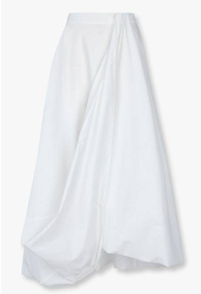 가장 먼저 눈에 띄는 아이템은 화이트 컬러의 벌룬 맥시 스커트입니다. 풍성한 A라인 실루엣에 밑단 비대칭 드레이핑이 더해져 구조적인 볼륨감을 자랑하죠. 상의는 군더더기 없이 깔끔한 크롭 자켓을 선택해 다리가 길어 보이는 효과를 냈고, 안에 스트라이프 티셔츠를 레이어드하여 시원하면서도 캐주얼한 느낌을 살렸습니다.