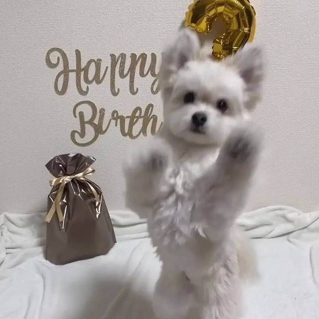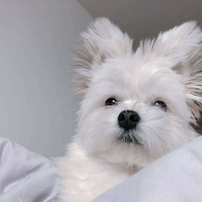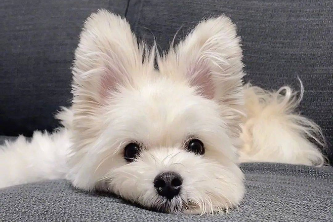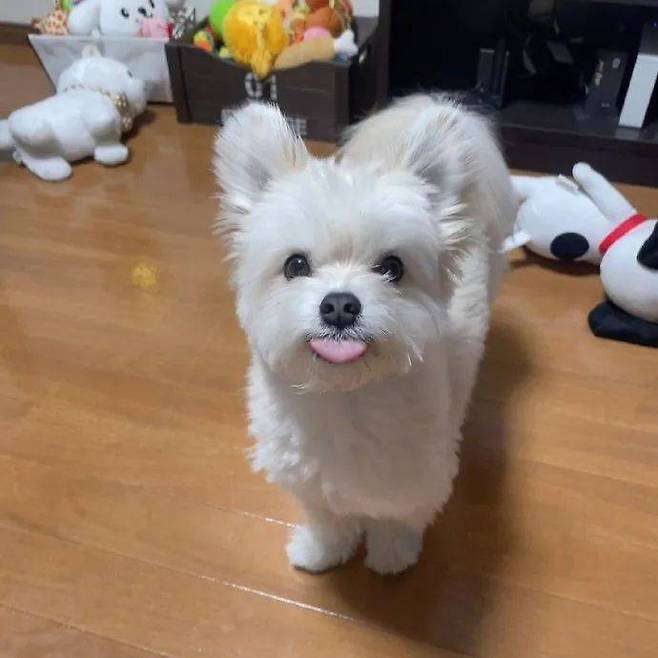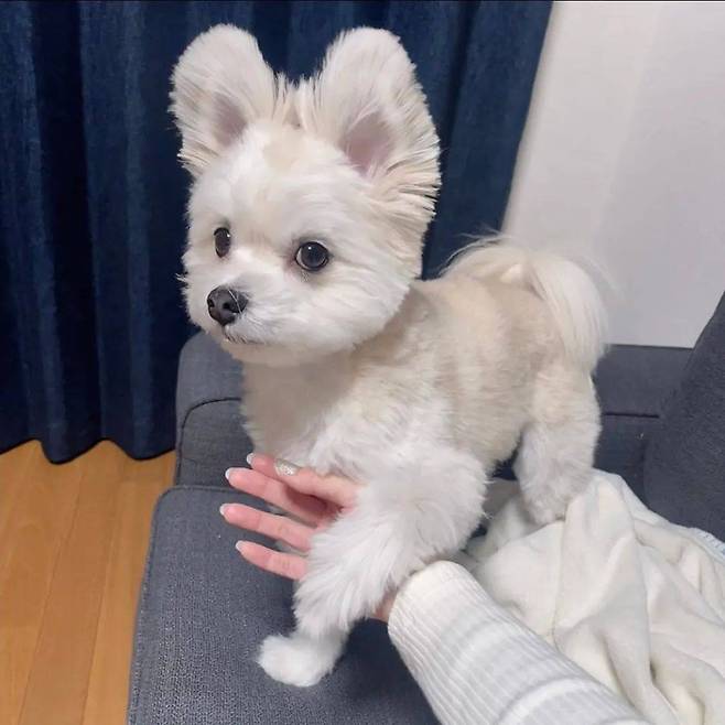 이 강아지는 포메라니안과 말티즈의 믹스견으로, 귀에 난 털이 특히 풍성하게 자라 있습니다.