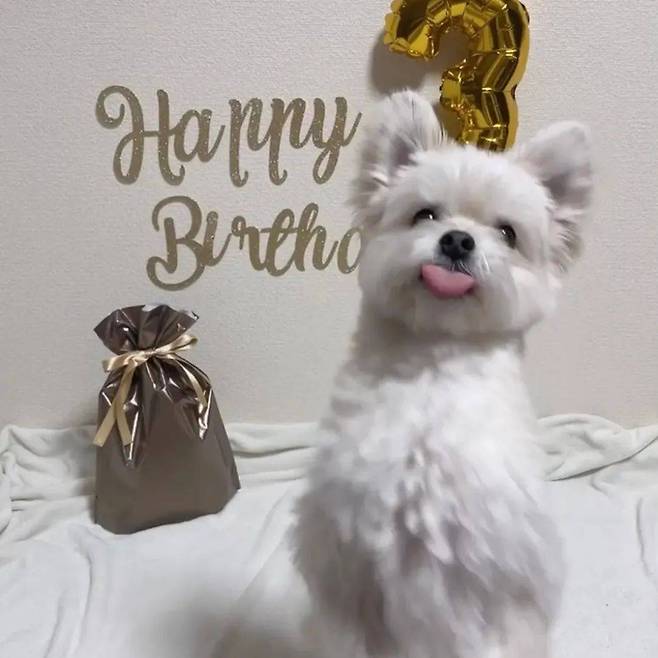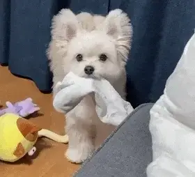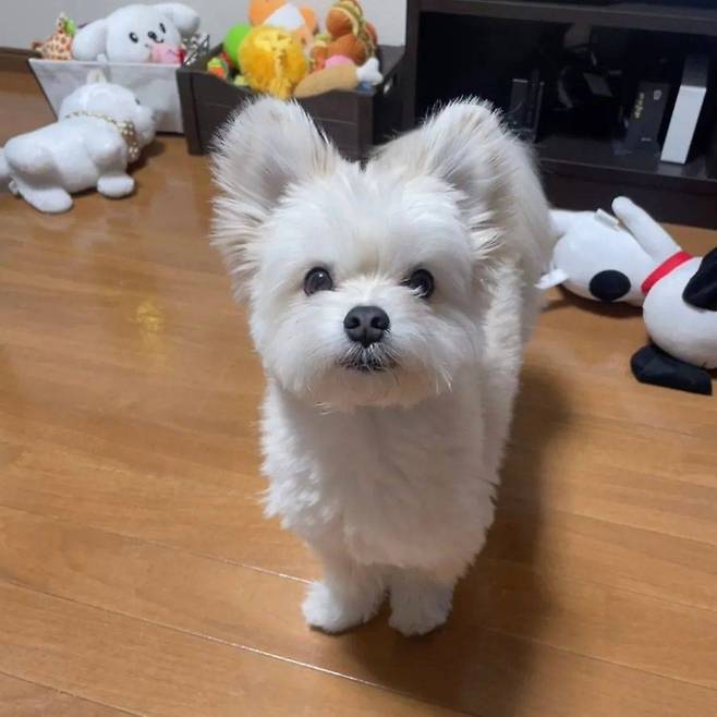 이 강아지는 포메라니안과 말티즈의 믹스견으로, 귀에 난 털이 특히 풍성하게 자라 있습니다.