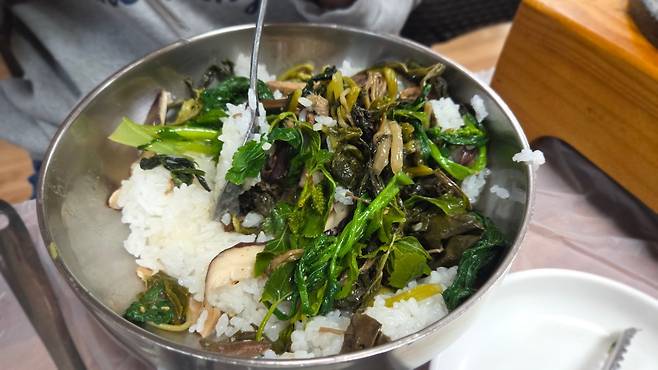 심원첫집의 산채정식이 특이한 점은 고추장이나 양념에 의존하지 않고, 나물 본연의 맛과 향을 최대한 살려낸다는 점입니다. 그리고 산채정식만 있고 제육이나 생선 같은 단백질이 없습니다. 담백하게 참기름 한 방울과 청국장만으로도 밥 한 그릇을 뚝딱 비울 수 있을 만큼 산채의 조화가 훌륭합니다. 저는 산채와 반찬을 하나 하나 먹어봤는데 짠 것이 거의 없고 담백했습니다. 여기에 돌솥밥의 누룽지까지 남김없이 즐길 수 있어 정말 배불렀습니다.