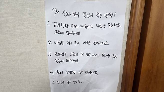 심원첫집의 산채정식이 특이한 점은 고추장이나 양념에 의존하지 않고, 나물 본연의 맛과 향을 최대한 살려낸다는 점입니다. 그리고 산채정식만 있고 제육이나 생선 같은 단백질이 없습니다. 담백하게 참기름 한 방울과 청국장만으로도 밥 한 그릇을 뚝딱 비울 수 있을 만큼 산채의 조화가 훌륭합니다. 저는 산채와 반찬을 하나 하나 먹어봤는데 짠 것이 거의 없고 담백했습니다. 여기에 돌솥밥의 누룽지까지 남김없이 즐길 수 있어 정말 배불렀습니다.