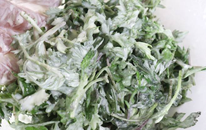 쑥 부침개의 주인공은 쑥입니다. 부침가루와 튀김가루를 반씩 섞으면 훨씬 바삭해져요. 여기에 찬물을 넣어 아주 묽게 반죽하세요. 쑥에 반죽 옷을 두껍게 입히는 것이 아니라, 쑥들이 서로 겨우 달라붙을 정도로만 가볍게 묻혀주어야 쑥의 식이섬유와 향을 온전히 즐길 수 있습니다.