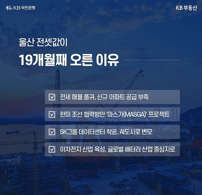 최근 울산광역시 아파트 전세가격이 19개월 연속 오르고 있습니다. 조선·이차전지·AI데이터센터 등 산업 호재가 이어지면서 주거 수요가 늘어난 것이 주요 원인으로 꼽히고 있는데요. 다른 광역시, 지방 도시와 비교해 울산 전세시장이 어떤 특징을 보이는지 KB부동산에서 알아봤습니다.
