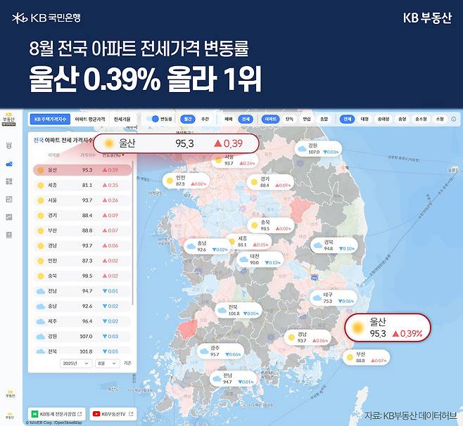 KB부동산 데이터허브 KB통계기상도에 따르면 8월 전국에서 전세 가격지수가 가장 많이 오른 곳은 울산광역시로 95.3을 기록했습니다. 한달 동안 0.39% 상승해 세종 0.35%, 서울 0.26% 보다 많이 올랐습니다. 8월 한 달간 울산에서는 중구와 남구가 각각 0.53% 상승했고 북구 0.45%, 동구 0.37%, 울주군 0.03% 등 전 지역에 걸쳐 오른 것으로 조사됐습니다.