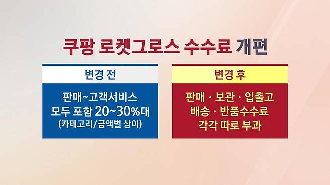 쿠팡에는 외부 판매자의 상품을 자사 '로켓배송'처럼 보내 주는 '로켓그로스'라는 대행 서비스가 있습니다. 그런데 이 서비스의 수수료 체계가 앞으로 크게 개편됩니다. 사실상 요금 인상을 쉽게 하는 방식이라는데, 판매자의 부담은 소비자 가격 인상으로 이어질 가능성이 높습니다. 정보윤 기자, 쿠팡이 어떤 식으로 수수료 체계를 바꾸는 건가요?