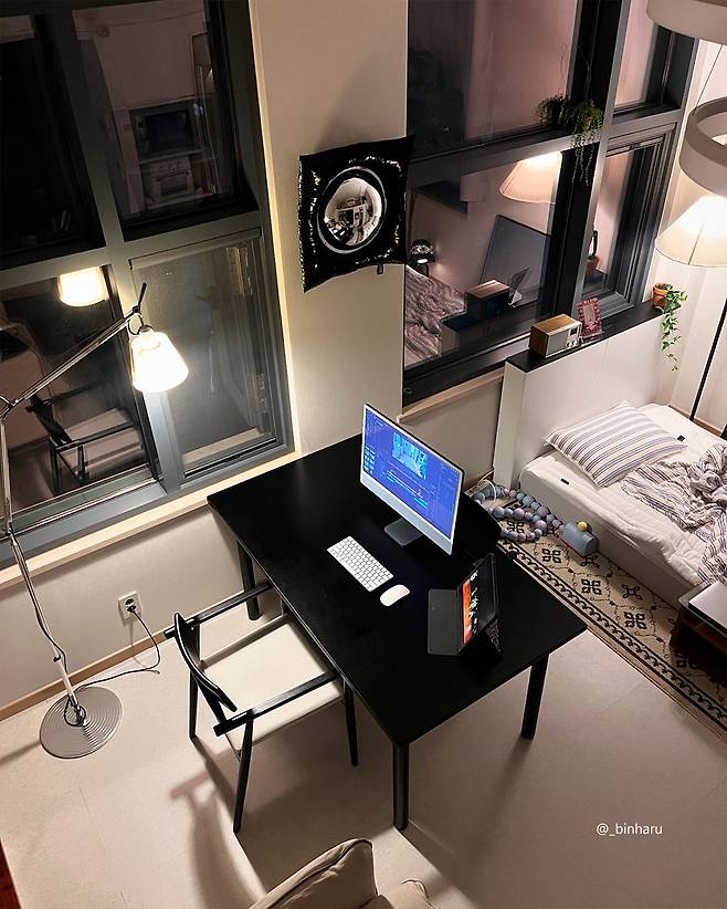 복층의 묘미는 높은 천장, 그리고 바깥 풍경이 훤히 보이는 큰 창문이죠! 특히 낮이며 밤이며 예쁜 경치를 감상할 수 있다는 점이 가장 마음에 드는데요. 좋은 건 크게 보라는 말이 있듯이, 멋진 야경도 크게 감상하면 더욱 좋잖아요. 🌃 쌀쌀한 가을밤, 밤하늘이 가득 찬 창문 앞에 앉아 하루를 마무리하는 혼술 한 잔은 어떠세요? 나지막이 보이는 창밖 불빛이 마음에 따스한 온기를 더할 거예요.
