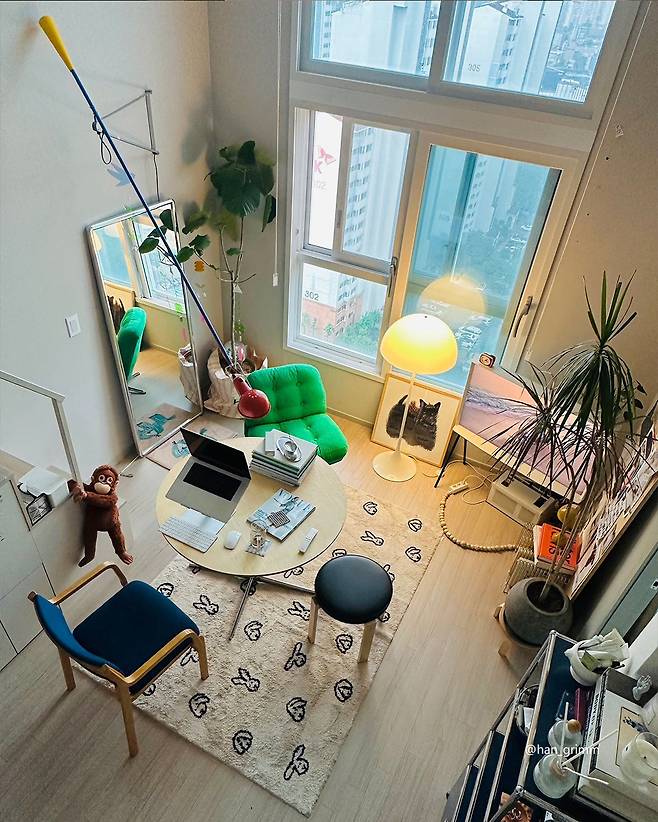 복층 공간과 밝고 경쾌한 색상의 아이템들이 만나 탁 트인 개방감이 느껴지는 특별한 구석이에요! 서늘한 날씨에 몸과 마음이 움츠러든다면, 통통 튀는 컬러 아이템을 추천할게요. 🌈 동절기에도 활력을 잃지 않도록, 집 안 곳곳에 따뜻한 아우라를 더해 줄 거예요. 1집러 @han_grimm님과 같이, 높은 층고를 과감하게 가로지르는 선명한 컬러의 벽 조명을 달아 집 전체에 포인트를 줄 수도 있어요. ✨