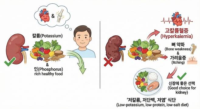 체내에 칼륨이 과도하게 축적되면 ‘고칼륨혈증’이 발생할 수 있으며, 이는 근육 마비나 부정맥을 유발해 심한 경우 심장마비까지 이어질 수 있습니다. 또한 인 수치가 높아지면 뼈에서 칼슘이 빠져나가 골다공증이 생기고 피부 가려움증이 나타날 수 있습니다.