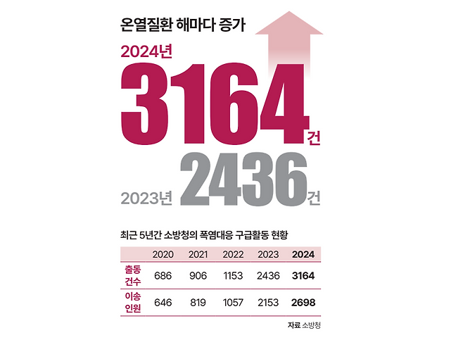 온열질환으로 인한 출동 건수는 2020년 686건, 2021년 906건, 2022년 1153건, 2023년 2436건으로 해마다 증가해왔습니다. 소방청은 올여름 폭염에 따른 인명피해를 최소화하기 위해 1660대에 달하는 전국의 모든 119 구급차에 조끼 형태 등의 얼음팩과 소금, 물 스프레이, 전해질용액 등 폭염대응 구급장비를 비치하고 폭염에 적극 대응하겠다고 밝혔습니다.