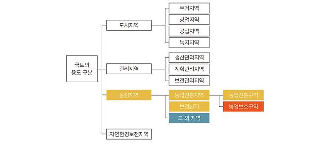 우선, 이번 개정안을 이해하기 위해서는 농림지역의 개념을 알 필요가 있다. 우리나라는 국토의 효율적인 관리를 위해 용도를 구분하고 있다. 크게 ‘도시지역’, ‘관리지역’, ‘농림지역’, ‘자연환경보전지역’으로 나눈다. 농림지역은 다시 ‘농업진흥지역’과 ‘보전산지’, ‘그 외 지역’으로 나뉘어 관리된다. 그리고 이런 농림지역은 해당 용도를 위해 농어업인들의 농어가를 제외한 일반인들의 단독주택 건축을 규제하고 있었다.