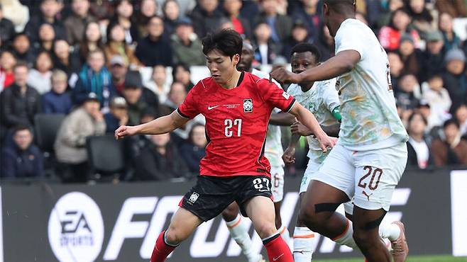 한국 축구 대표팀의 3월 A매치 2연전에서 홍명보호의 측면 날개 공격수로 뛰었던 배준호는 이날 벤치에서 대기하다 전반 35분 2선 공격수로 나선 토마시 리고가 부상을 당하자 곧바로 교체 투입됐습니다.
