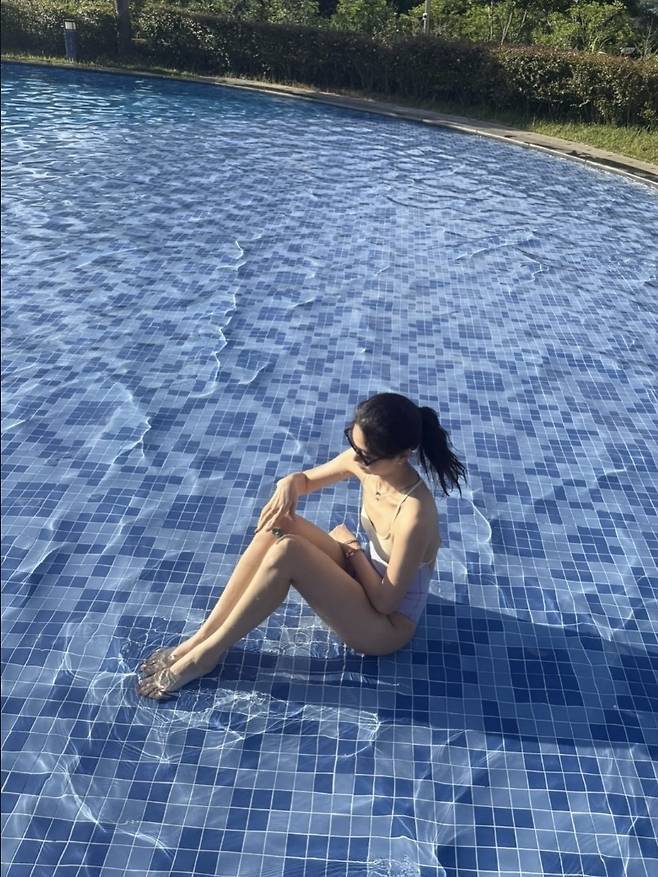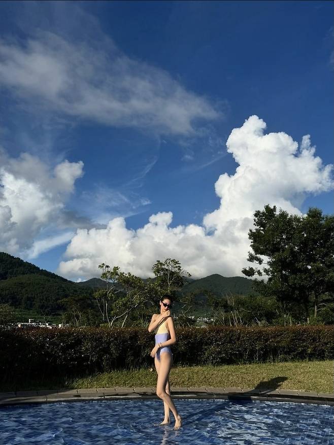 상큼한 라벤더와 크림 컬러의 배색이 돋보이는 바디슈트 형태의 수영복을 착용해 청량한 여름 분위기를 극대화했습니다.