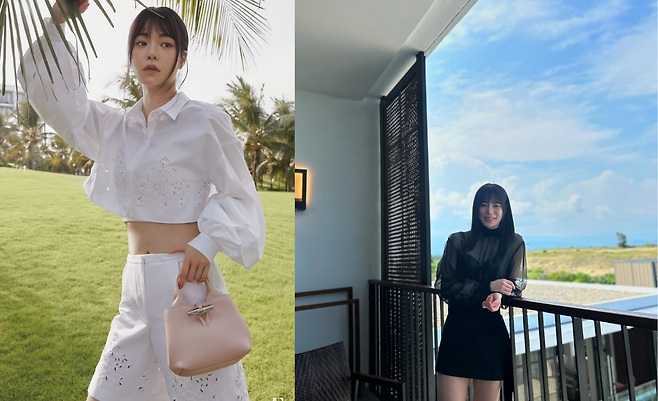 임지연은 크롭 셔츠와 하이웨이스트 반바지로 구성된 화이트 셋업을 착용해 청량한 리조트룩을 선보이고 있다. 상의와 하의 모두 레이스 디테일이 더해져 여성스러움을 강조하며, 크림 컬러의 미니백으로 산뜻한 포인트를 연출했다. 자연광과 어우러진 스타일링이 여유로운 무드를 자아낸다.