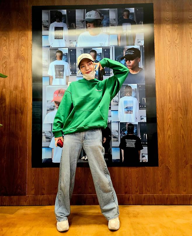 임지연은 그린 컬러의 오버사이즈 후드와 와이드 데님 팬츠, 화이트 스니커즈로 캐주얼 스트리트 패션을 완성하고 있다. 볼캡과 마스크로 편안함을 더했고, 전체적으로 자유분방한 분위기가 느껴진다. 밝은 표정과 여유로운 포즈가 스타일의 경쾌함을 배가한다.