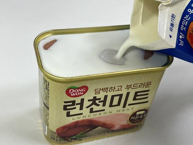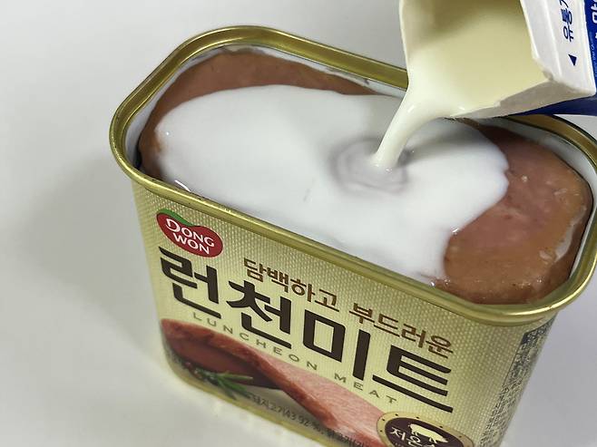 우유를 스팸에 부은 후 양쪽을 5분간 담가두면 햄 특유의 잡내 등이 제거됩니다. 또한 통조림 햄은 지방성분이 많은데 겉면에 달라붙은 기름기도 우유에 씻겨나가기 때문에 조금 더 담백하게 즐길 수 있습니다.