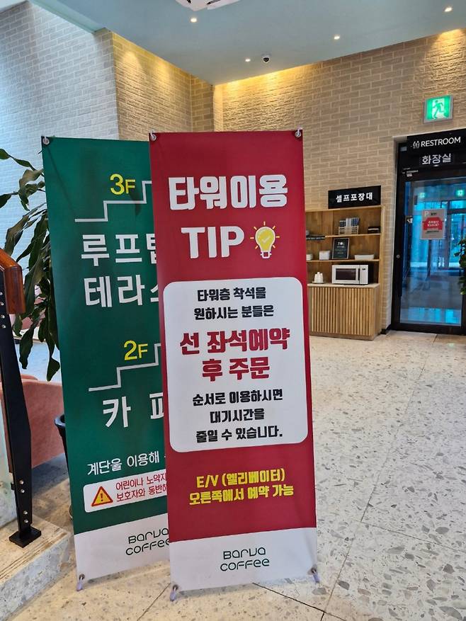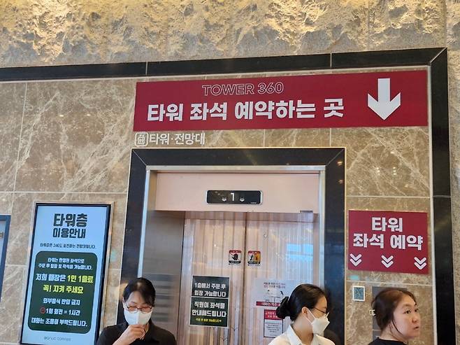 건물로 들어서면 1층에 베이커리 카페 답게 빵이 종류별로 진열되어 있다. 빵과 음료를 1층에서 구입해 타워층으로 올라가는 구조다. 물론 1층에도 좌석이 있어서 여기를 이용할 수도 있다. 타워층 착석을 위해서는 선 좌석예약 후 주문하라고 쓰여 있다. 엘리베이터 오른쪽에서 자리는 예약할 수 있고 직원이 번호를 부르면 엘리베이터에 탑승할 수 있다. 단, 타워를 올라가려면 1인 1음료 주문이 필수이고 입장 시 영수증을 보여줘야 한다.